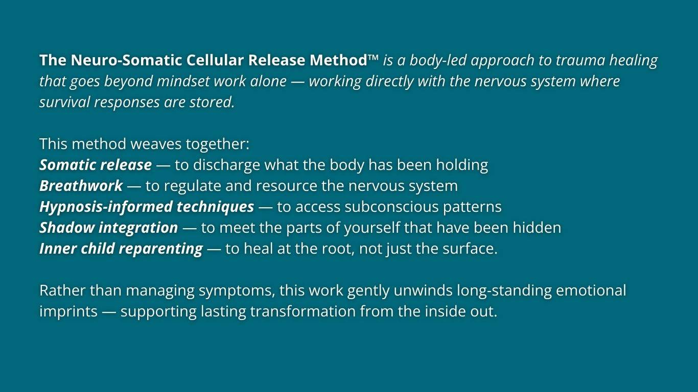 This work is integrative by design. It draws from somatic processing, nervous system regulation, hypnosis-informed techniques, shadow work and inner child healing — bringing together what science and body-based wisdom both understand about how trauma is held and released.